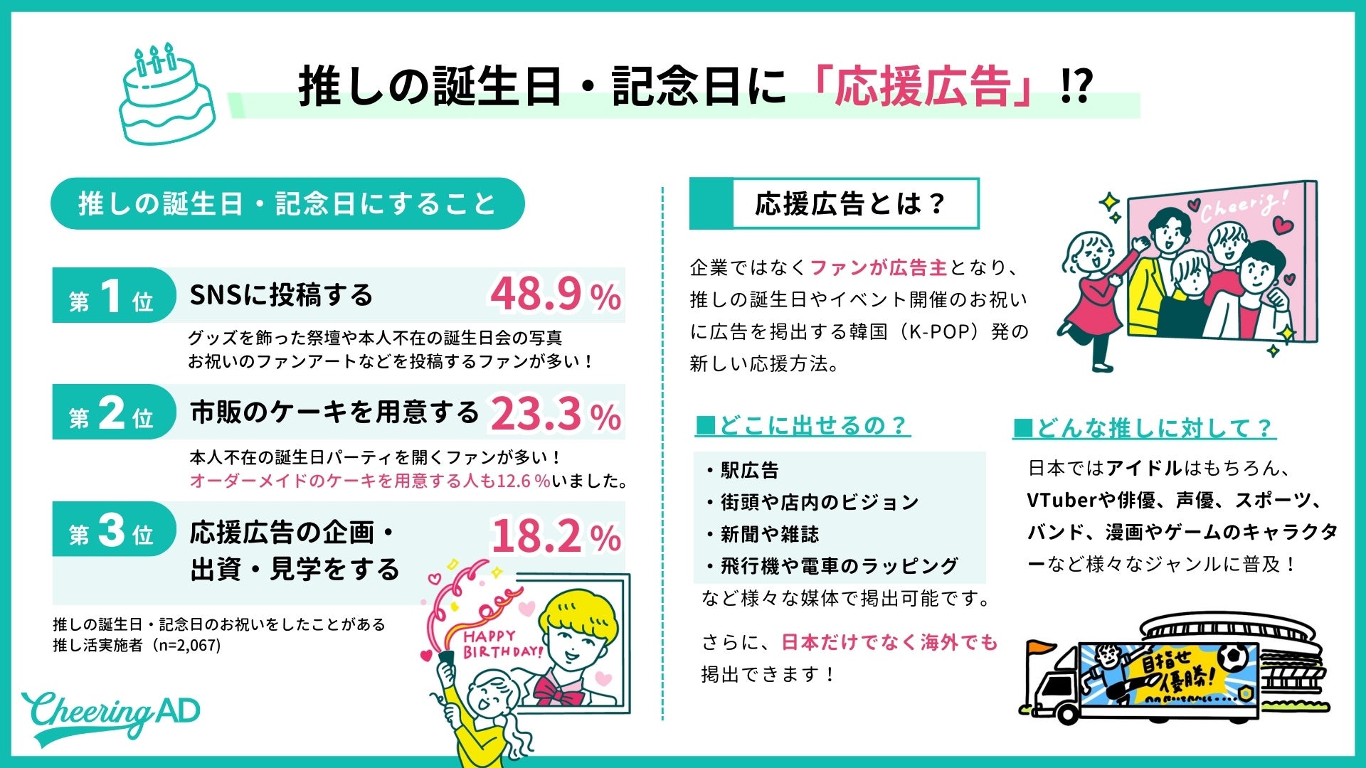 推しの記念日に行うことについて調査したところ、1位はSNSでの投稿、2位は市販のケーキを用意すること、3位は応援広告の企画・出資・見学であることがわかりました。応援広告とは、推しの誕生日や記念日にファンが広告主となって推しを祝う活動です。推しの特別な日を「広告」を通じてお祝いする文化が広がっていることが明らかになりました。