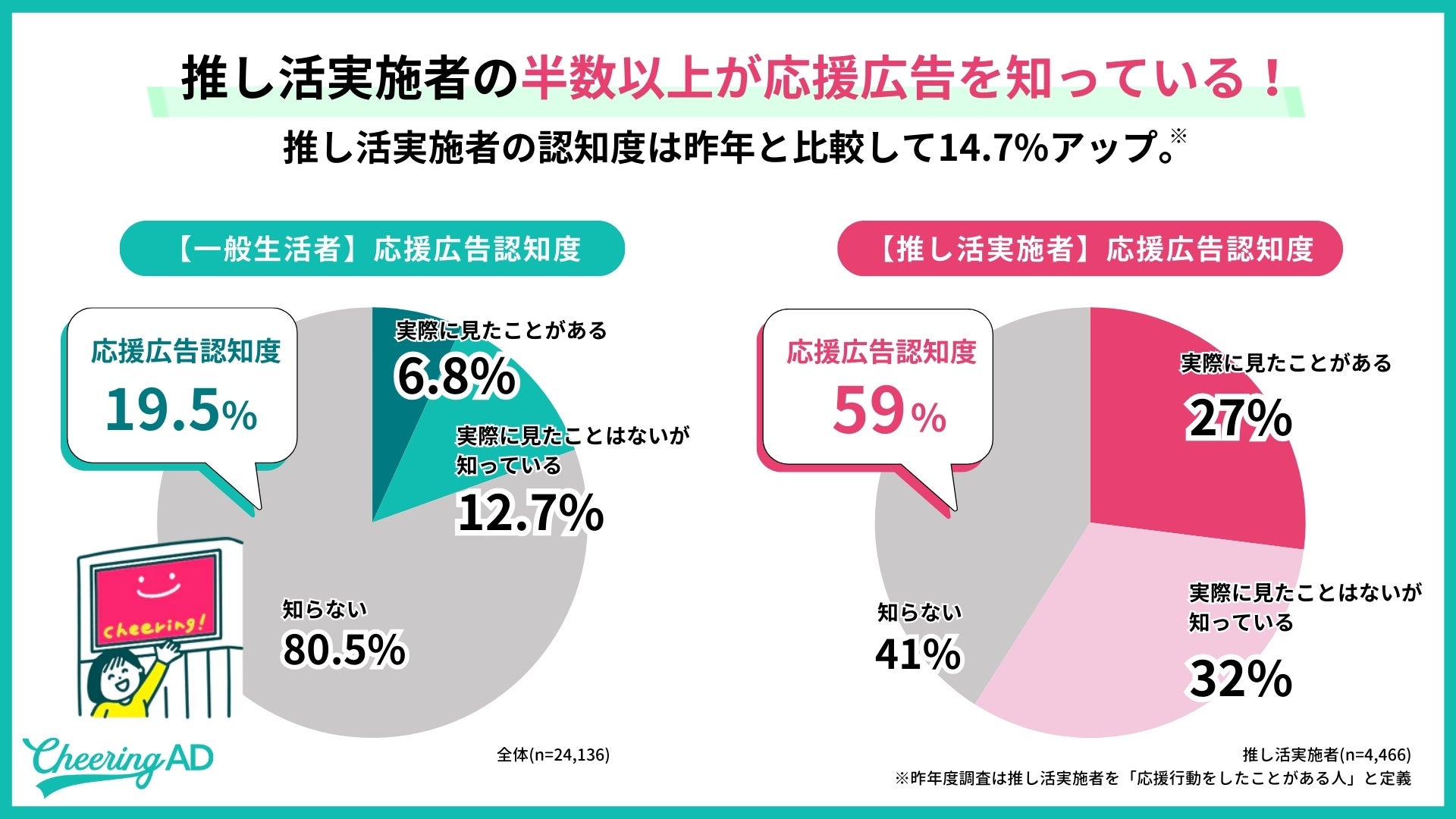 応援広告の認知率は、推しの有無に関わらず19.5%に達していることがわかりました。特に推し活をしている人の認知度は59%と高く、実際に見たことがある人も27%にのぼります。推し活実施者の認知度は、昨年より14.7ポイント増加しており、推し活をする人々の間で応援広告がますます広く知られ、目にする機会が増えていることが明らかになりました。