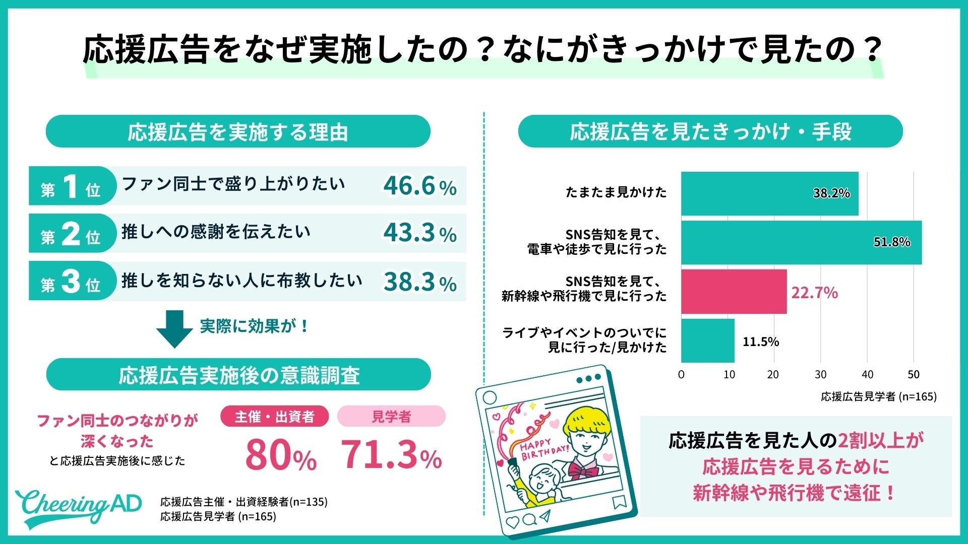応援広告の実施理由として最も多かったのは、「ファン同士で盛り上がりたいから」であり、実施後、80%のファンがファン同士のつながりが深まったと感じています。広告を見に行ったきっかけとしては、SNSを見て移動した層が多く、約2割が新幹線や飛行機を利用して広告を見に行っています。このように、「応援広告を見に行く行動」が推し活の一部として定着しつつあることが確認されました。