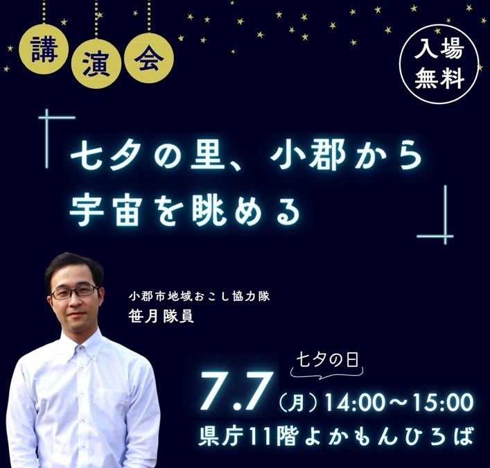 小郡市の地域おこし協力隊で活躍する笹月隊員が、七夕の里・小郡で星を眺める魅力や面白さをお話しします。参加者には、絵本「たなばた星の恋まじない」をプレゼント。ぜひご参加ください!