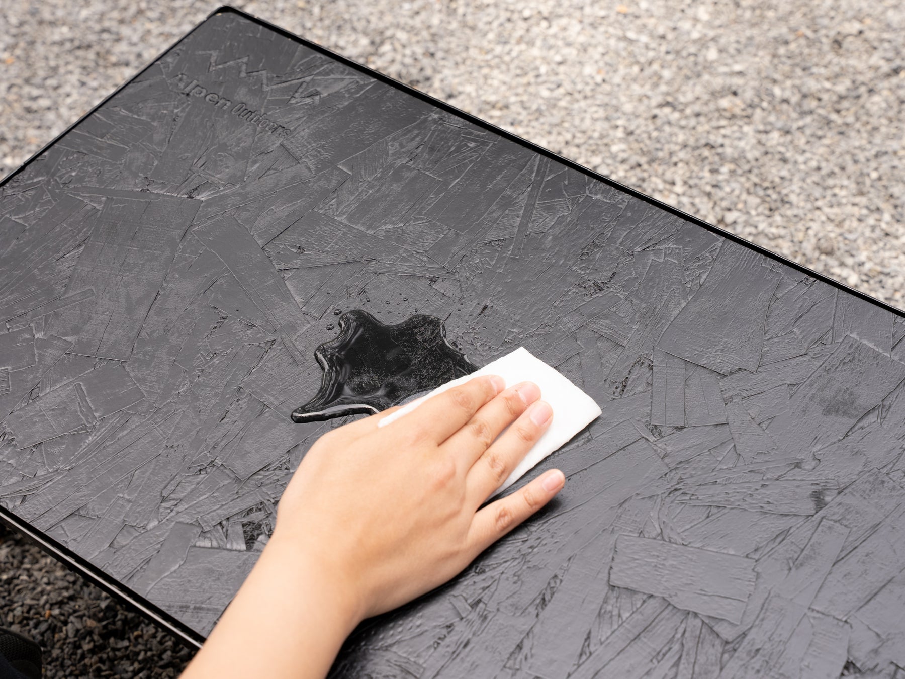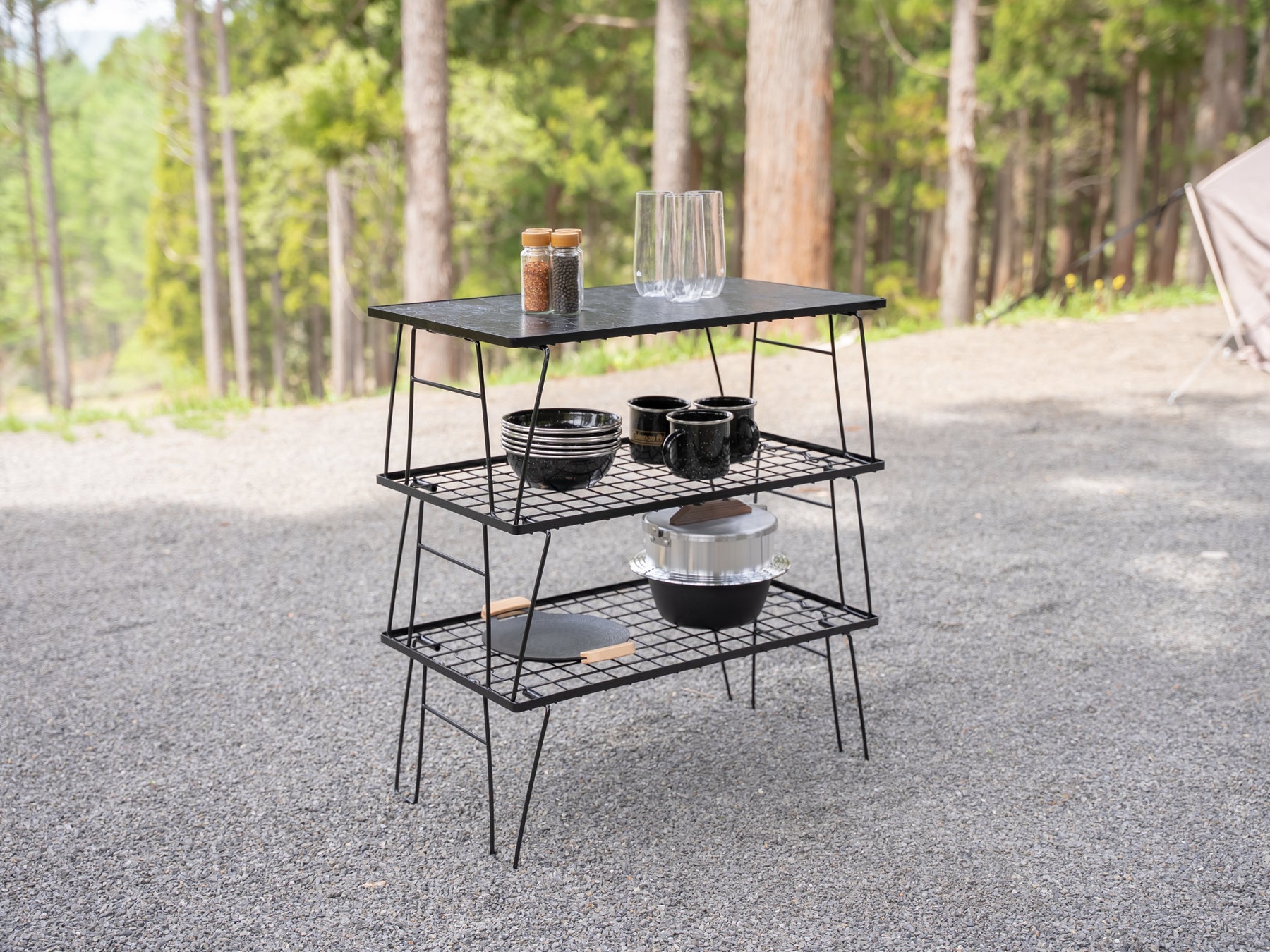 「軽量1.5kgアウトドアラック」に対応するウッド天板。ラックのメッシュ部分に天板を載せるだけで、フラットな作業スペースとして活用でき、テーブル仕様にアップデートできます。オシャレにアレンジできるOSBボードを採用。マットブラック塗装仕上げにより、無骨さと温もりを併せ持つアウトドアスタイルを演出し、サイトのレイアウトや用途に合わせて、自由にアレンジを楽しむことができます。
