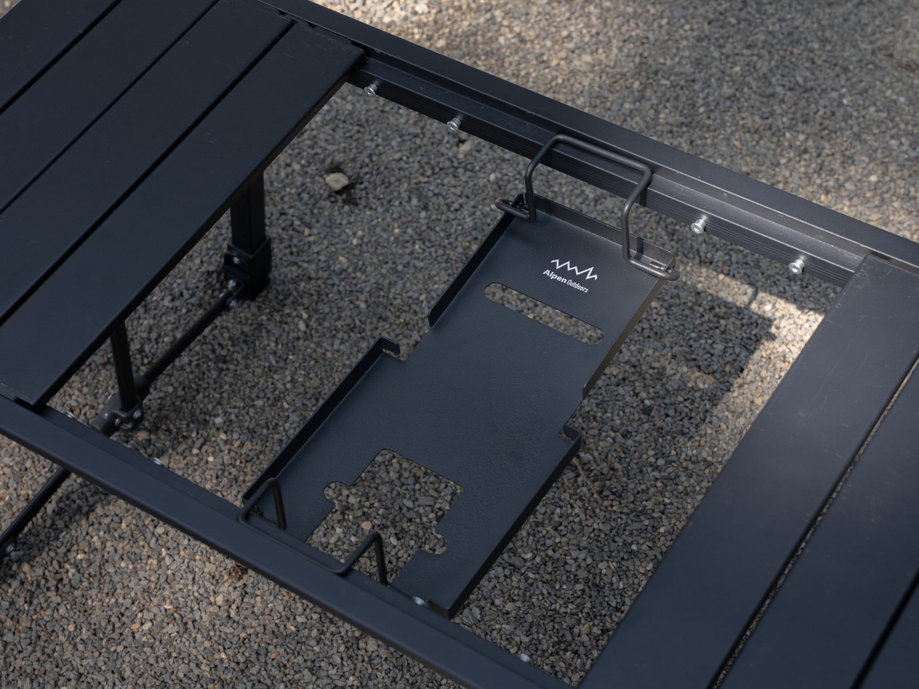 アルミユニットテーブルにシングルバーナーをインストールする専用の拡張オプションアイテム。シングルバーナーをテーブルにすっきりと設置できるだけでなく、輻射熱の影響によるガスボンベの温度上昇リスクを軽減する役割も果たします。安全性を高めつつ、アウトドアでの調理環境を快適に整えたいキャンパーやアウトドア愛好家のみなさんへおすすめのアイテムです。