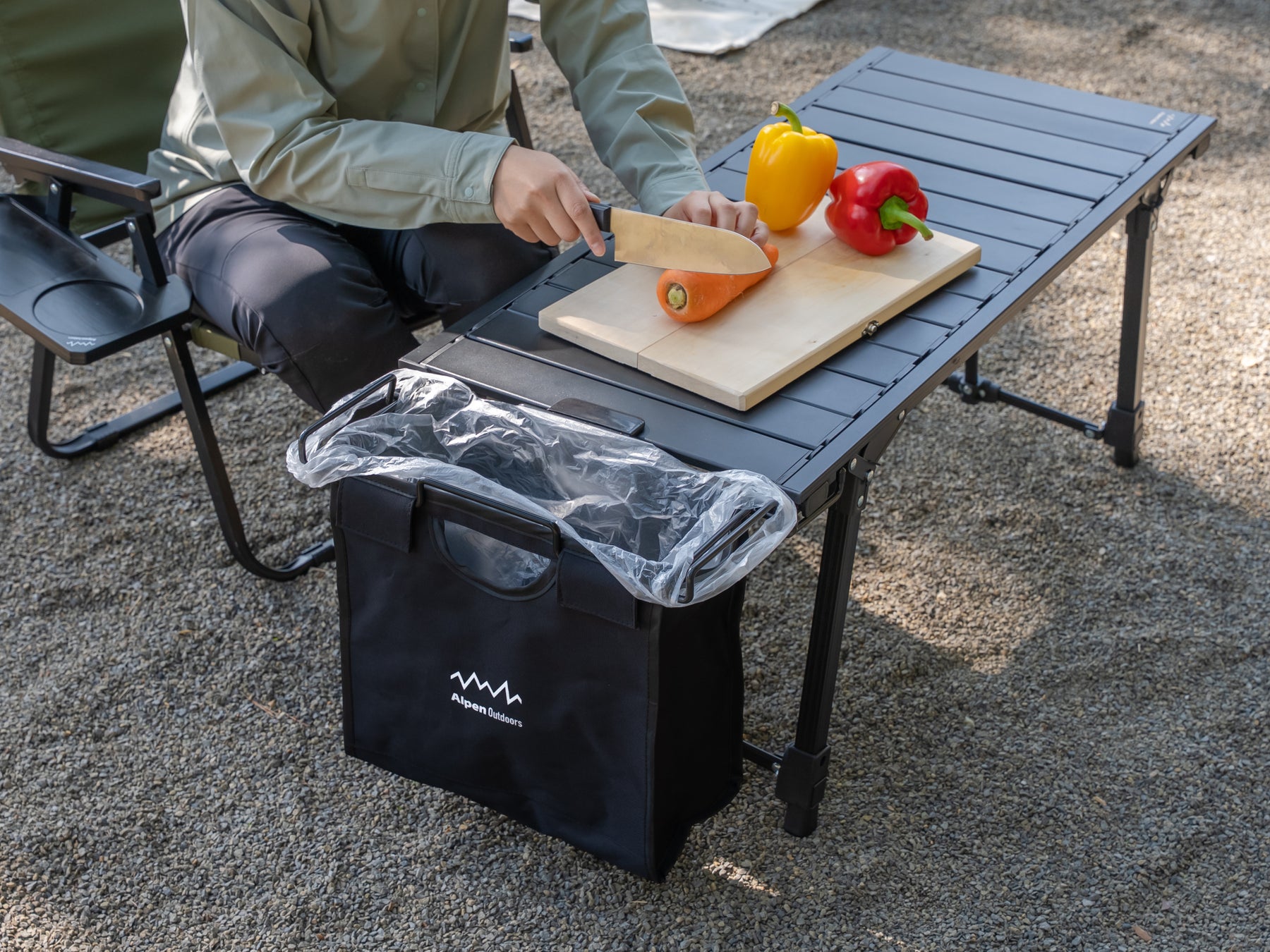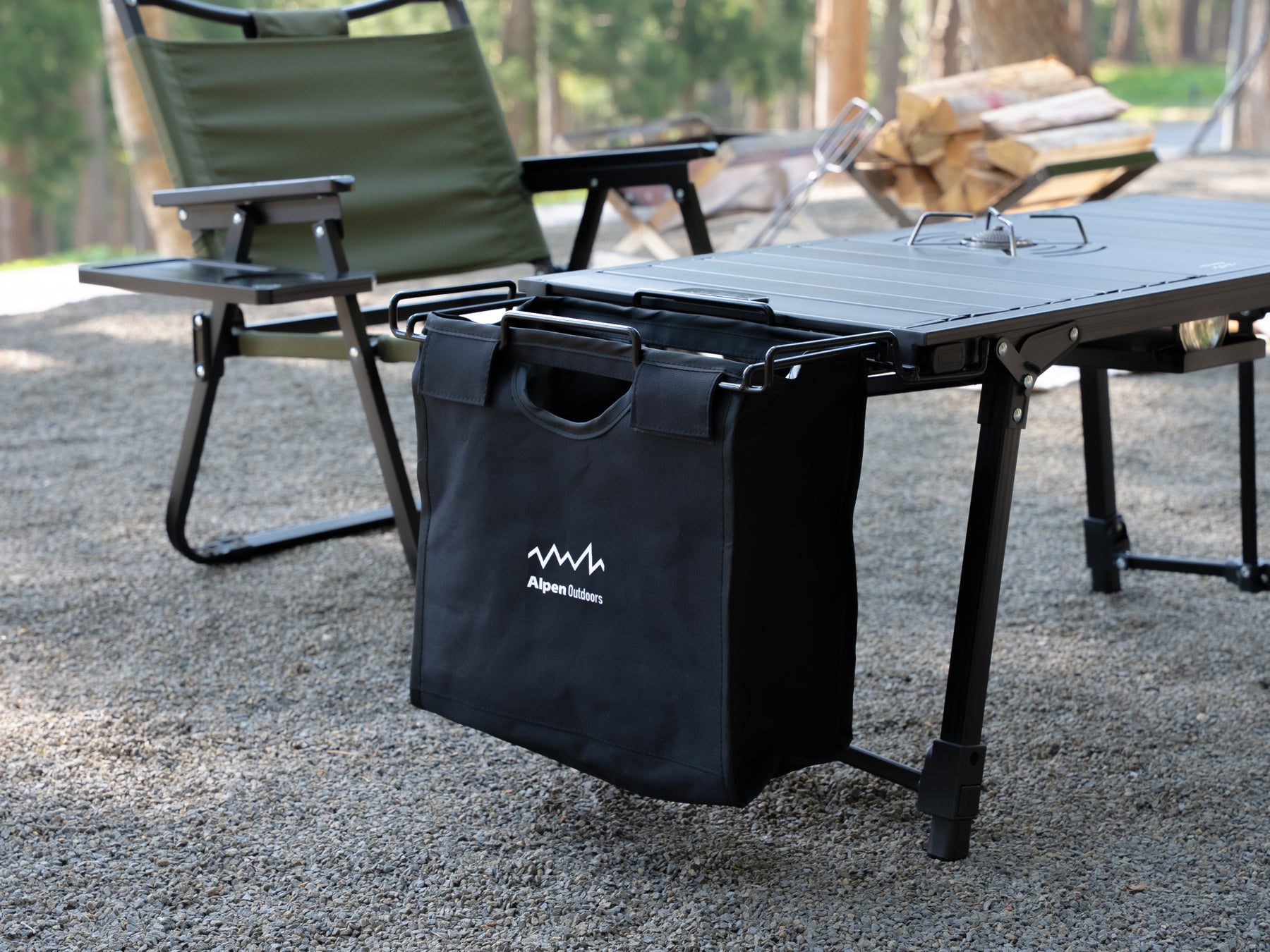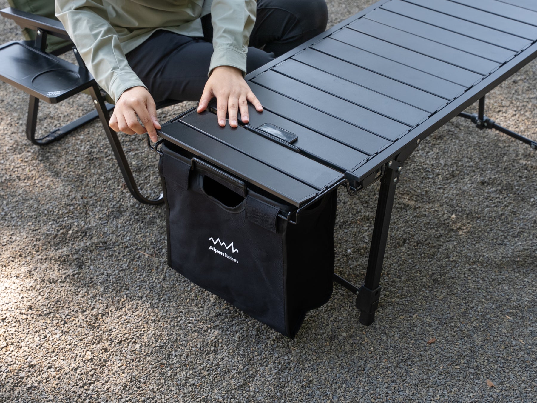 アルミユニットテーブルに対応するサイドストレージ。テーブルの拡張と同時に収納スペースを確保できるため、散らかりがちなキャンプギアを整理整頓し、調理や食事のスペースを広く確保できます。このサイドストレージを活用することで、アルミユニットテーブルがより万能なアウトドアキッチンやダイニングテーブルとして機能し、快適なキャンプ体験を実現するアイテムです。