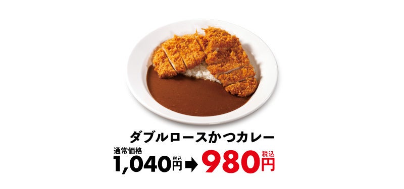 | 商品名 ダブルロースかつカレー 980円 ※お持ち帰りいただけます。 ※全て税込み価格です。また、店内・お持ち帰りの税込価格は同一です。 ※専門店と併設店では価格が異なります。 発売日 【マイカリー食堂専門店】販売中 【松屋併設店】4月11日(火)10時~ 【松のや併設店】4月12日(水)15時~ 対象店舗 一部店舗を除く全国のマイカリー食堂 |