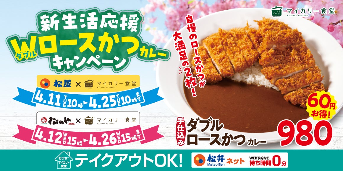 このたび松屋フーズ(本社:東京都武蔵野市、代表取締役社長:瓦葺一利)では、カレー専門店「マイカリー食堂」におきまして、松屋併設店4月11日(火)午前10時より、松のや併設店4月12日(水)午後3時より、「新生活応援Wロースかつカレーキャンペーン」を開催いたします。