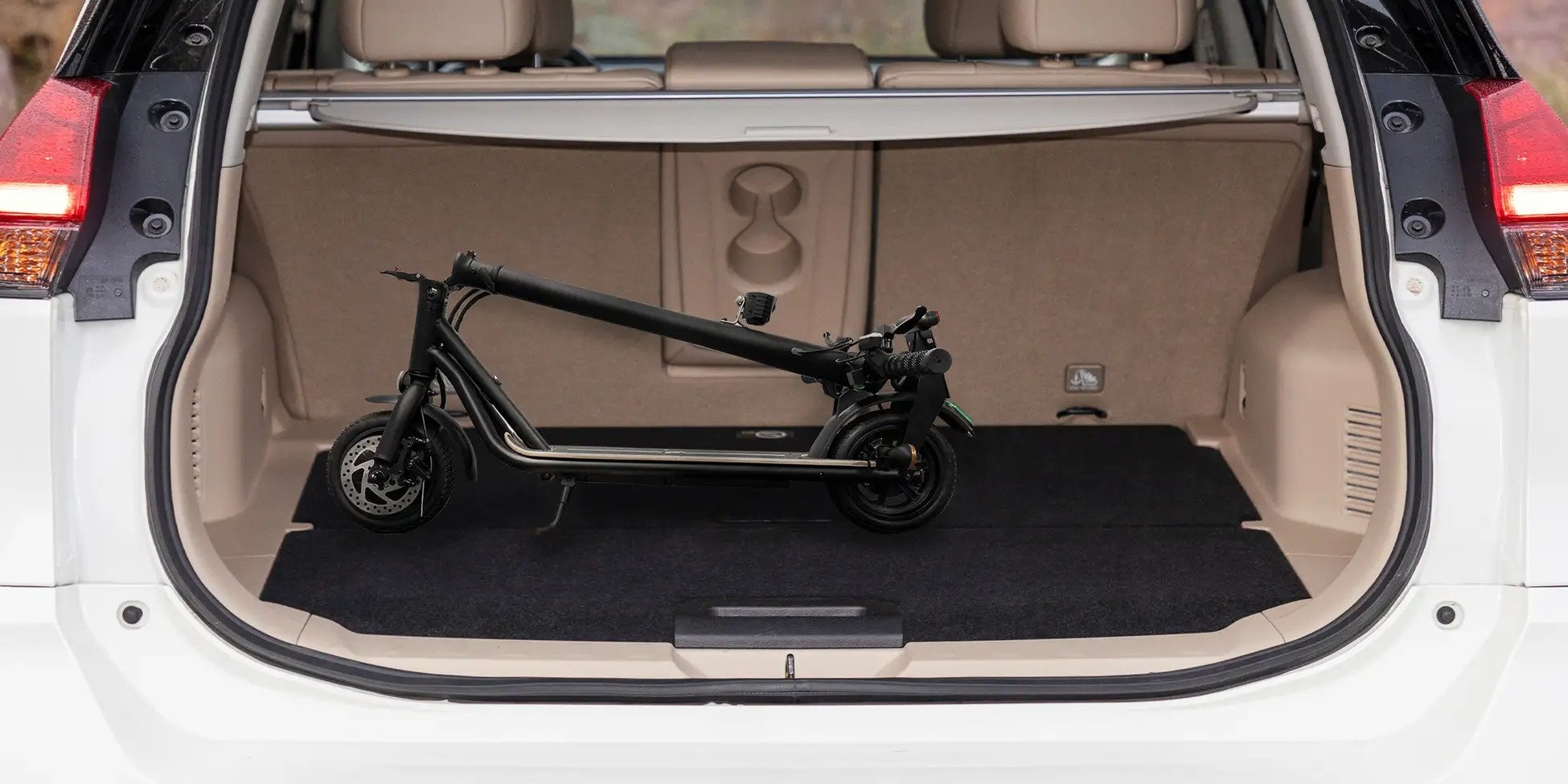 ちょっとした買い物、通勤や通学といった日常使いにぴったり。約5.5時間充電で約30㎞まで走行可能です。8.5インチのノーパンクタイヤを採用しているので、スムーズで安定感ある走行感を実現。IP54の防水・防塵機能を備えているので、雨や砂埃に強く耐久性が高いモデルです。盗難防止用ワイヤーロックが付いているので、駐輪の際も安心。前輪にはディスクブレーキ、後輪にドラムブレーキを採用し、安定した制動力を確保。後方や後方サイドの確認がしやすい、大型のバックミラーを左右に搭載し視認性アップ!