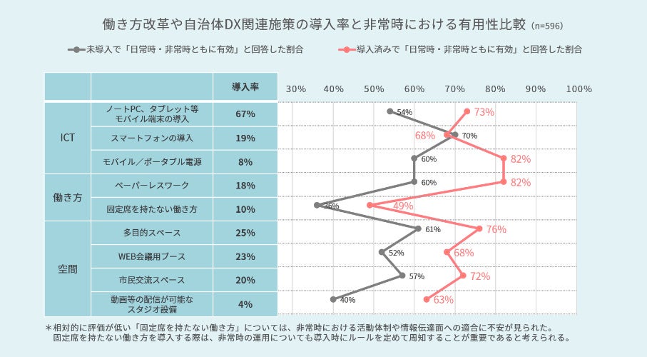 ・昨今では、働き方改革や自治体DXの流れを受け、働き方や職場環境を柔軟にする様々な 施策が実行され始めています。先行する自治体は未導入の自治体に比べ、その施策が非常時にも有用であると評価しています。
