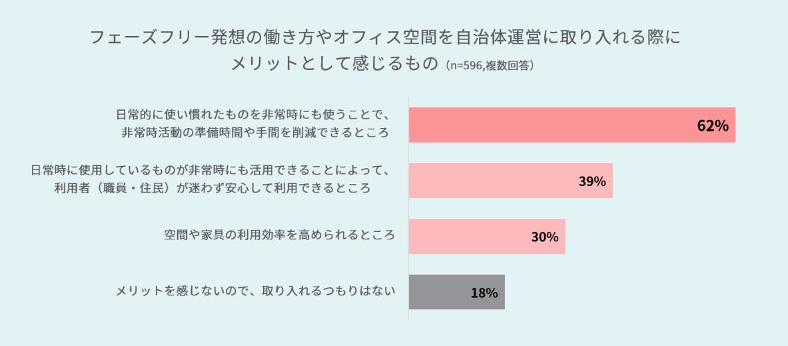 ・非常時活動の際に準備や片付けに時間がかかると、業務継続や住民サービス提供に多大な影響を与えます。今回の調査でも、フェーズフリー発想の働き方やオフィス空間では、「非常時活動の準備時間や手間を削減できる」というメリットが最も評価されていることがわかりました。