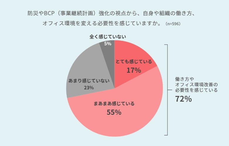 ・地方自治体職員へアンケート調査を行った結果、7割以上が防災やBCP(事業継続計画)強化の観点により、働き方やオフィス環境改善の必要性を感じているという回答が得られました。とくに、「レイアウトの柔軟性」「通路幅の充分な確保」に関して重要度と満足度の差が大きいことが分かっており、現在のオフィスでは非常時の安全確保や迅速な対応に関して強い課題があると推察できます。