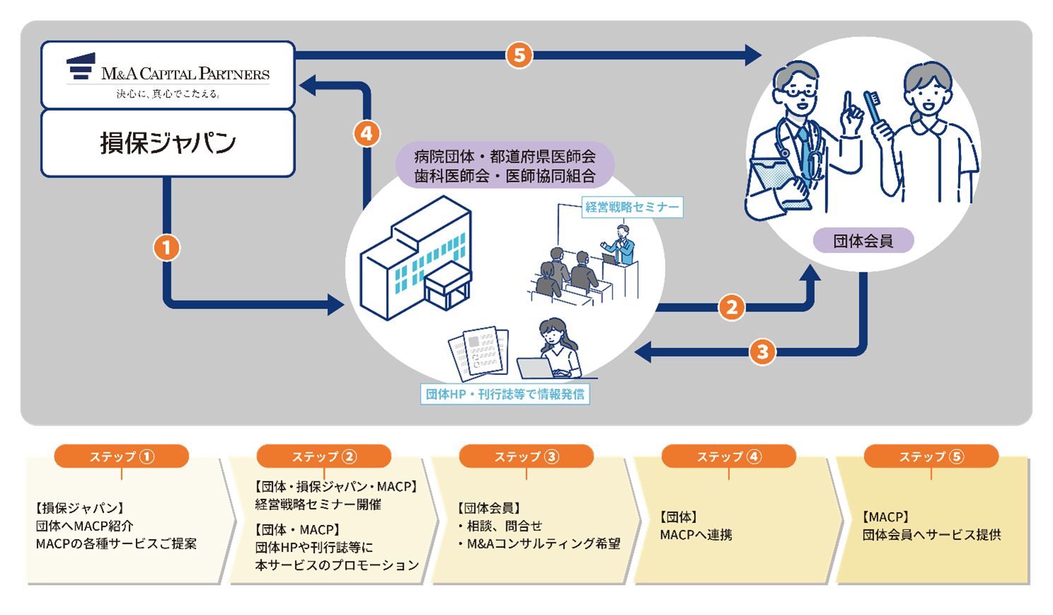 このような社会課題解決の一助となるべく、M&A仲介業界最大手のMACPが提供する医業承継コンサルティングを中心とした各種サービスを、損保ジャパンが病院団体・都道府県医師会・歯科医師会・医師協同組合等へ紹介する形で全国展開することとなりました。