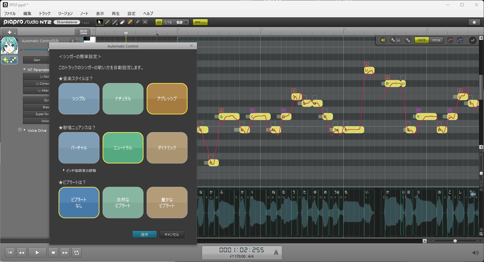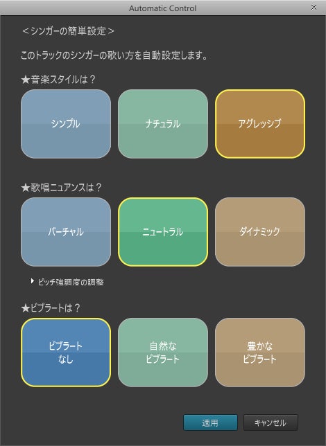 「アグレッシブ」では、激しめのピッチの動きや抑揚が付いた歌声が設定されます。
