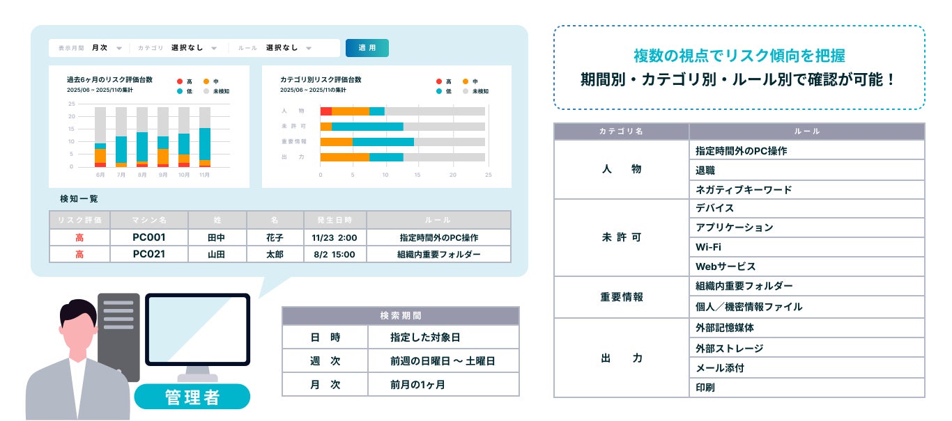 PC操作ログをルールベースで解析し、リスクをスコア化します。ダッシュボードでは、操作別や日次・週次・月次集計を表示し、リスクの高い操作を迅速に把握できます。