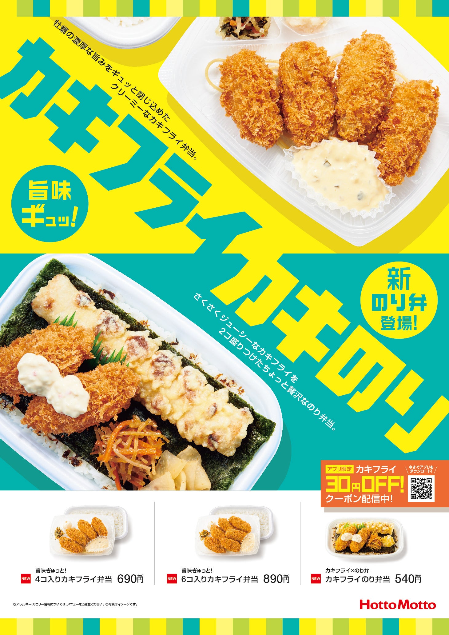 このたび「ほっともっと」では、旬の味覚である牡蠣を楽しむことができる『4コ入りカキフライ弁当』690円と『6コ入りカキフライ弁当』890円、定番ののり弁当にカキフライ2コを盛り付けた『カキフライのり弁当』540円を、2023年11月15日(水)より新発売いたします。