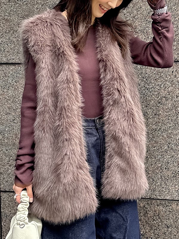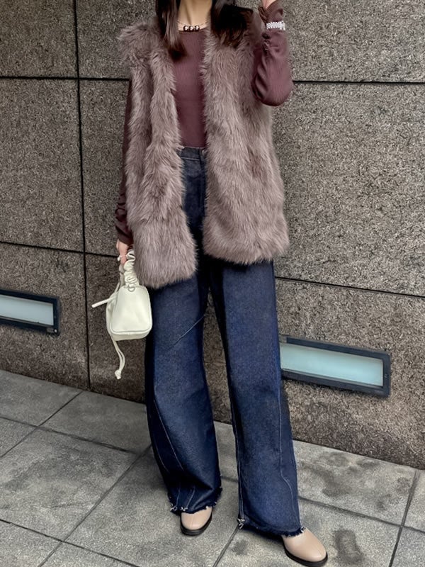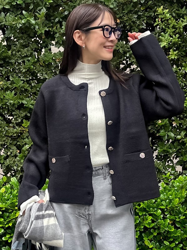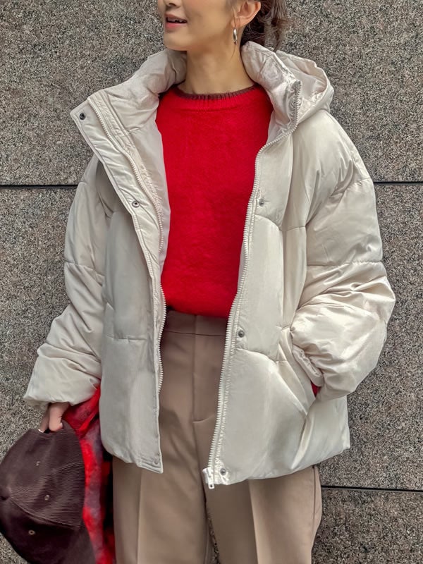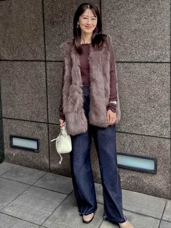 ボリュームがあり高級感のあるファージレなのでインナーはすっきりとタイトなニットを。