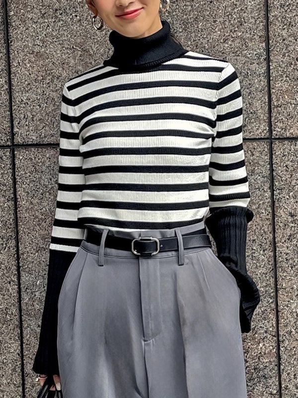 ボーダーが映えるニットはお袖の切り替えもアクセントになるので、ボトムにインするスタイリングに。