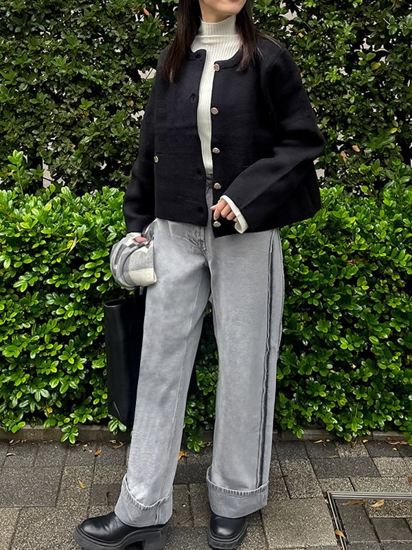 秋冬に欠かせないモノトーンですが、重くなりすぎないようにインナーとボトムは明るめカラーで、