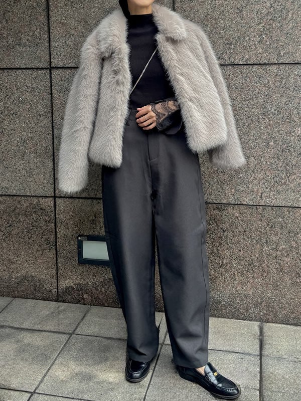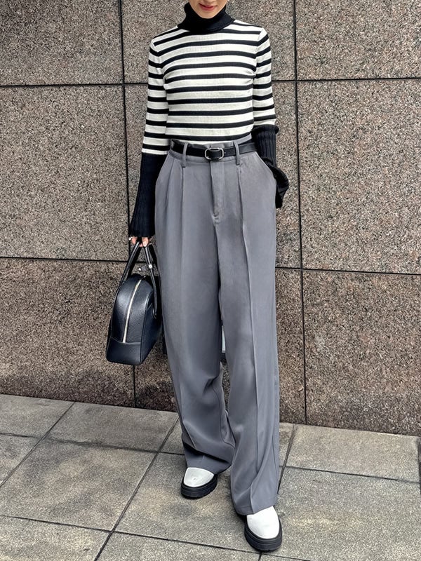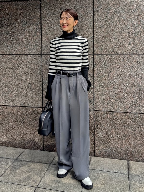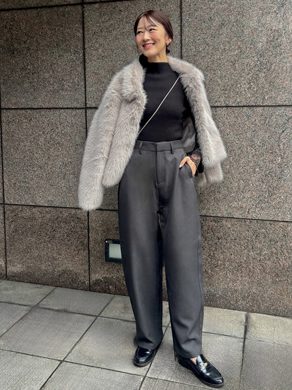 モノトーンですが重くなりすぎないように、とろみ感のあるパンツをグレーカラーで合わせました。
