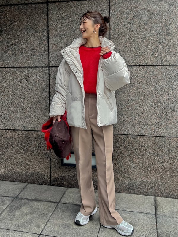 ダウンコートをきれいめに着用したく、スラックス合わせに。
