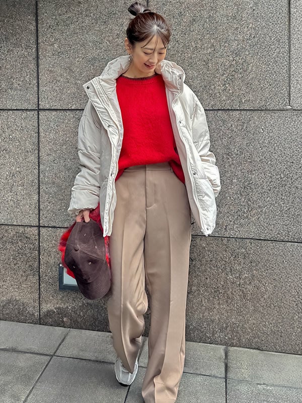アイボリーの優しいカラーのコートにはレッド×ベージュカラーで暖色系にまとめました。
