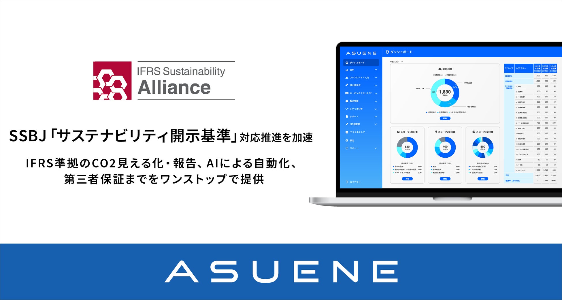 「ASUENE」はSSBJ基準に対応可能な機能を実装済み。IFRS準拠の算定・AI自動化、第三者保証までをワンストップで提供