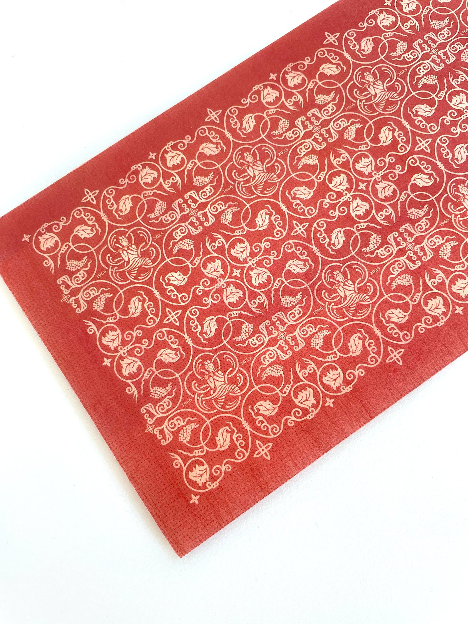 今回CCCアートラボにて制作するオリジナルグッズは、これまで国立劇場の価値と記憶をともに紡いできたお客様への感謝としばらくのお別れのご挨拶の気持ちを込めて、過去に舞台に使⽤された緞帳の柄から抽出したモチーフと国立劇場の天女の紋章を織り交ぜた祝祭感のあるデザインとなっています。
