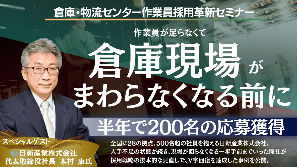 【半年で200名獲得した採用戦略を特別公開!】倉庫・物流センター作業員採用革新セミナーを2023年5月11日(木)に開催|物流コンサルの船井総研ロジ