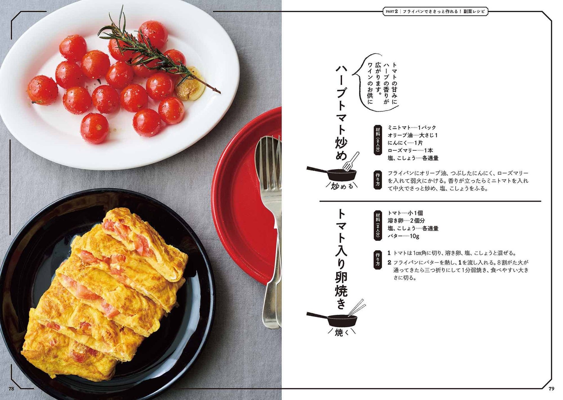 『フライパン1つで2品献立』は、フライパン1つだけで夜ご飯の献立ができるレシピを紹介するレシピブック。副菜、主菜の順で作るシンプルな手順で、ご飯づくりをずっと簡単にしてくれます。