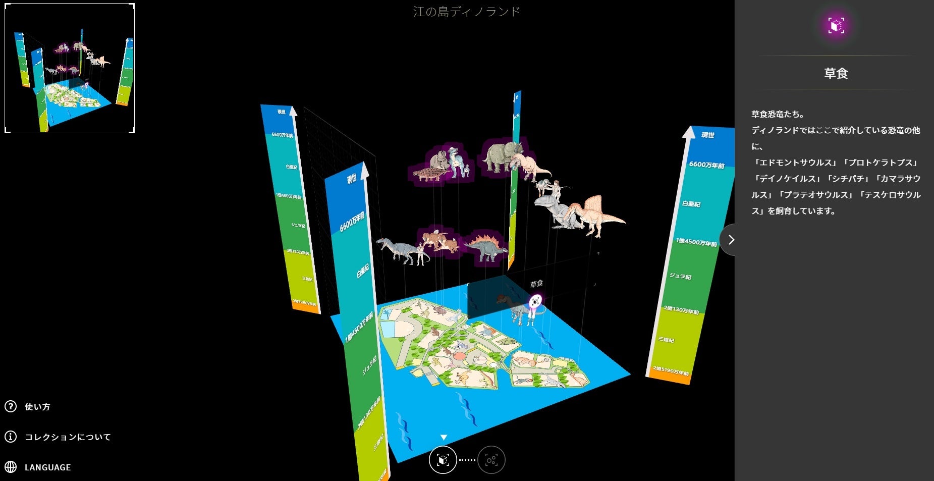 ② 「ディノサン」の舞台「江の島ディノランド」をバーチャルに体験できる「見どころキューブ」!
