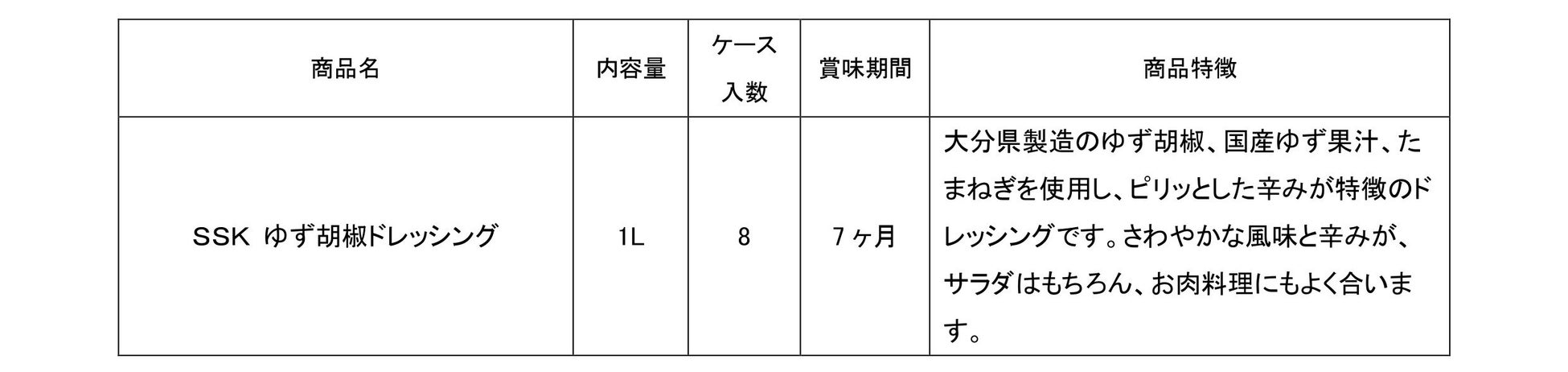 エスエスケイフーズ株式会社(本社:静岡市葵区)は、業務用商品に新味として「SSK ゆず胡椒ドレッシング」を発売いたします。