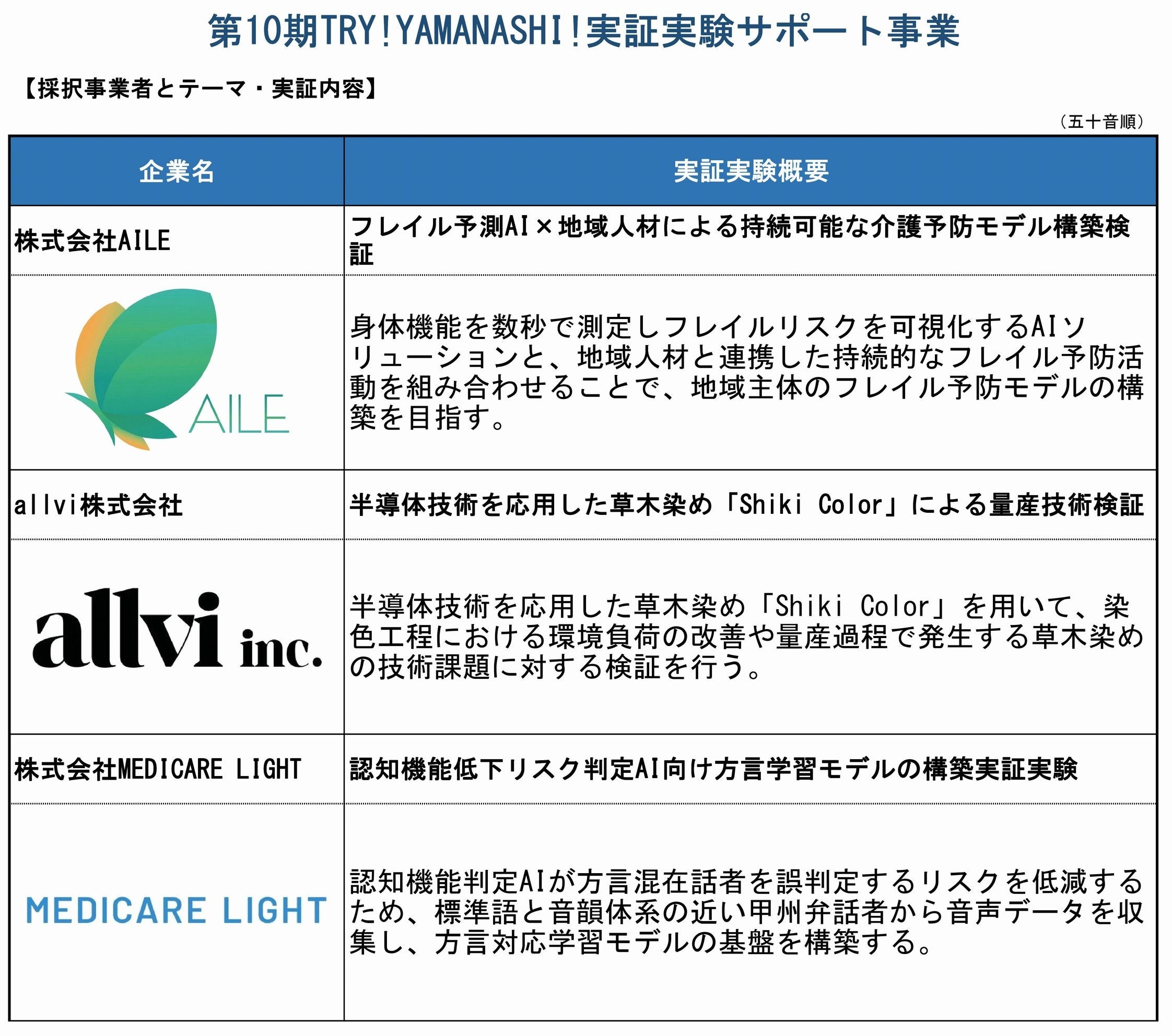 山梨県(知事:長崎幸太郎)が実施している、最先端技術やサービスを有するスターアップ企業等に伴走し、山梨県全域を対象にした実証実験を全面的にサポートする「第10期TRY!YAMANASHI!実証実験サポート事業」において、3月17日に二次審査を行い、応募総数54社の中から3社を採択しました。