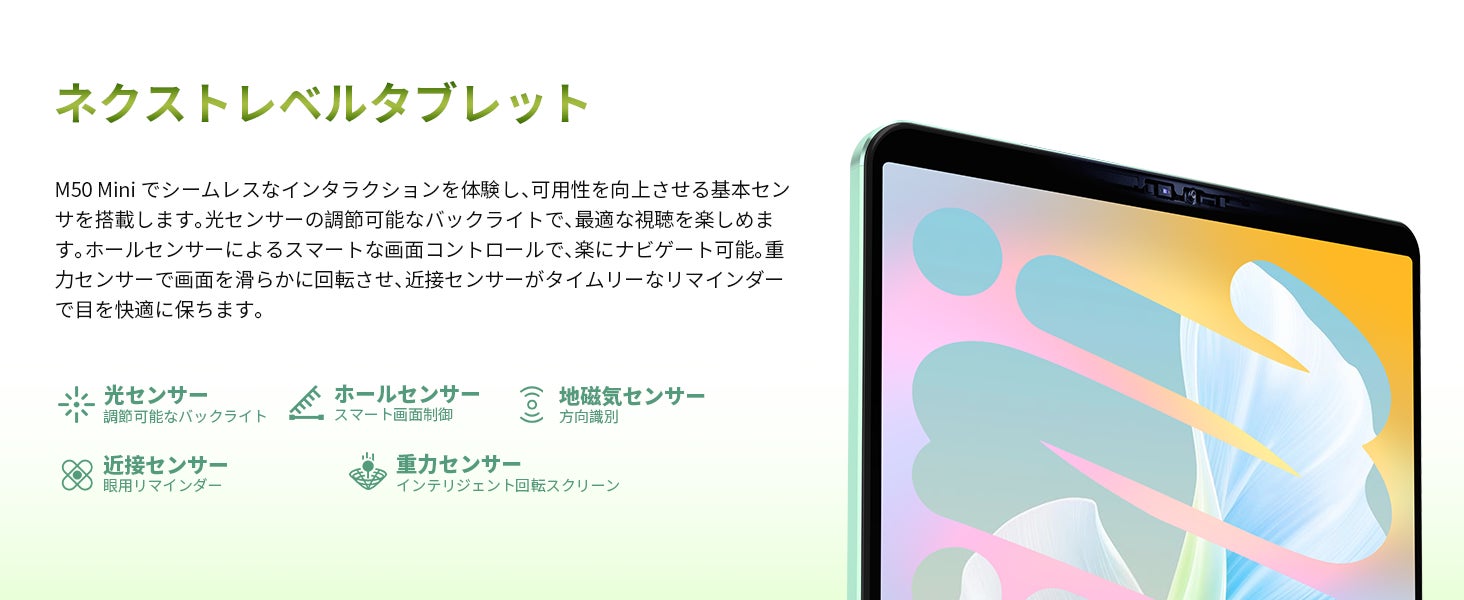 M50 Miniでシームレスなインタラクションを体験し、可用性を向上させる基本センサを搭載します。光センサーの調節可能なバックライトで、最適な視聴を楽しめます。ホールセンサーによるスマートな画面コントロールで、楽にナビゲート可能。重力センサーで画面を滑らかに回転させ、近接センサーがタイムリーなリマインダーで目を快適に保ちます。