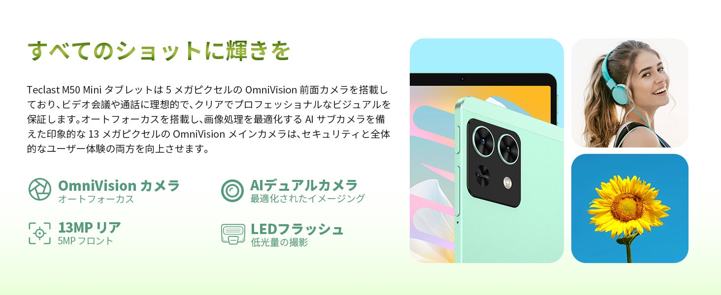 Teclast M50 Miniタブレットは5メガピクセルのOmniVision前面カメラを搭載しており、ビデオ会議や通話に理想的で、クリアでプロフェッショナルなビジュアルを保証します。オートフォーカスを搭載し、画像処理を最適化するAIサブカメラを備えた印象的な13メガピクセルのOmniVisionメインカメラは、セキュリティと全体的なユーザー体験の両方を向上させます。