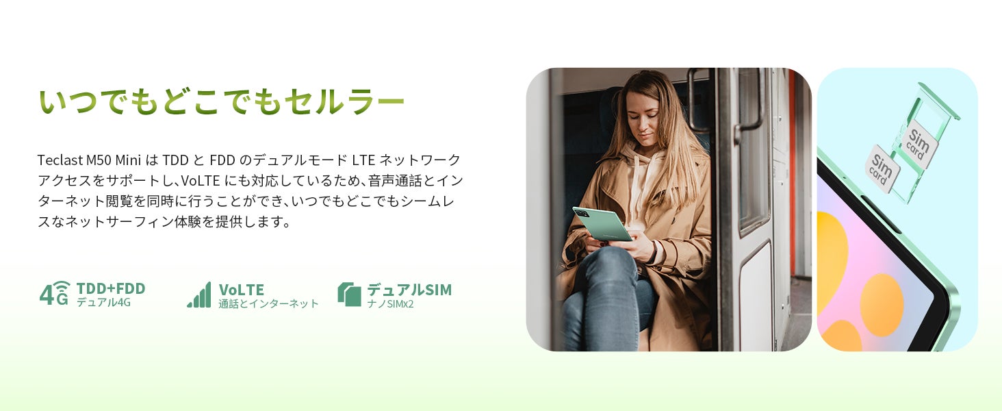 Teclast M50 MiniはTDDとFDDのデュアルモードLTEネットワークアクセスをサポートし、VoLTEにも対応しているため、音声通話とインターネット閲覧を同時に行うことができ、いつでもどこでもシームレスなネットサーフィン体験を提供します。