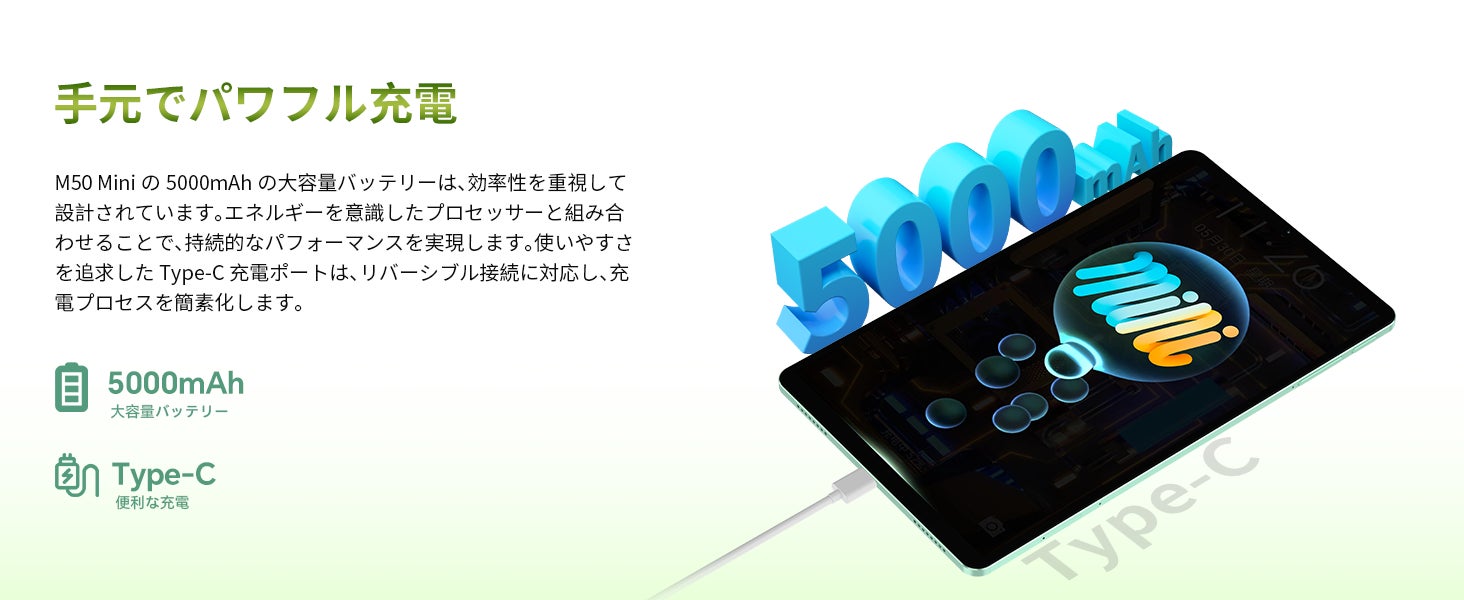 M50 Miniの5000mAhの大容量バッテリーは、効率性を重視して設計されています。エネルギーを意識したプロセッサーと組み合わせることで、持続的なパフォーマンスを実現します。使いやすさを追求したType-C充電ポートは、リバーシブル接続に対応し、充電プロセスを簡素化します。