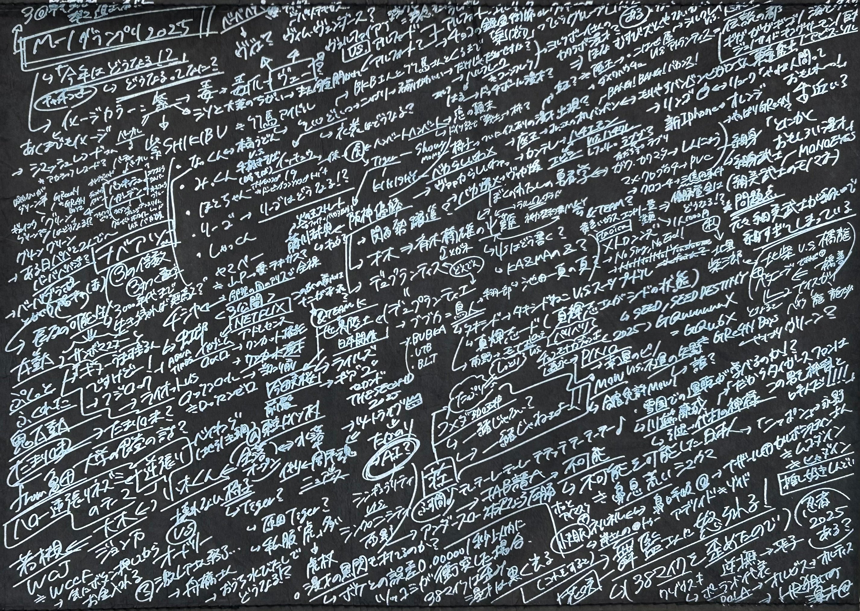 『漫才過剰考察』のカバーを外すと現れる図とは異なる、くるまさんが特典ブックカバーのために新たに書き下ろした渾身の図は、「M-1グランプリ2025」の予想を起点にダイナミックな脱線を起こし、あらゆる方向に考えを広げています。著者の頭の中をそのまま覗いたような、見ごたえたっぷりのマインドマップです。