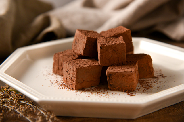 周囲にはココアパウダーがきれいにまぶされており、上品な見た目です。食べると、バニラアイスを包んでいる生チョコが溶け出し、濃厚な味わいが口いっぱいに広がります。冷たくてコクのあるバニラアイスとの相性も抜群です。
