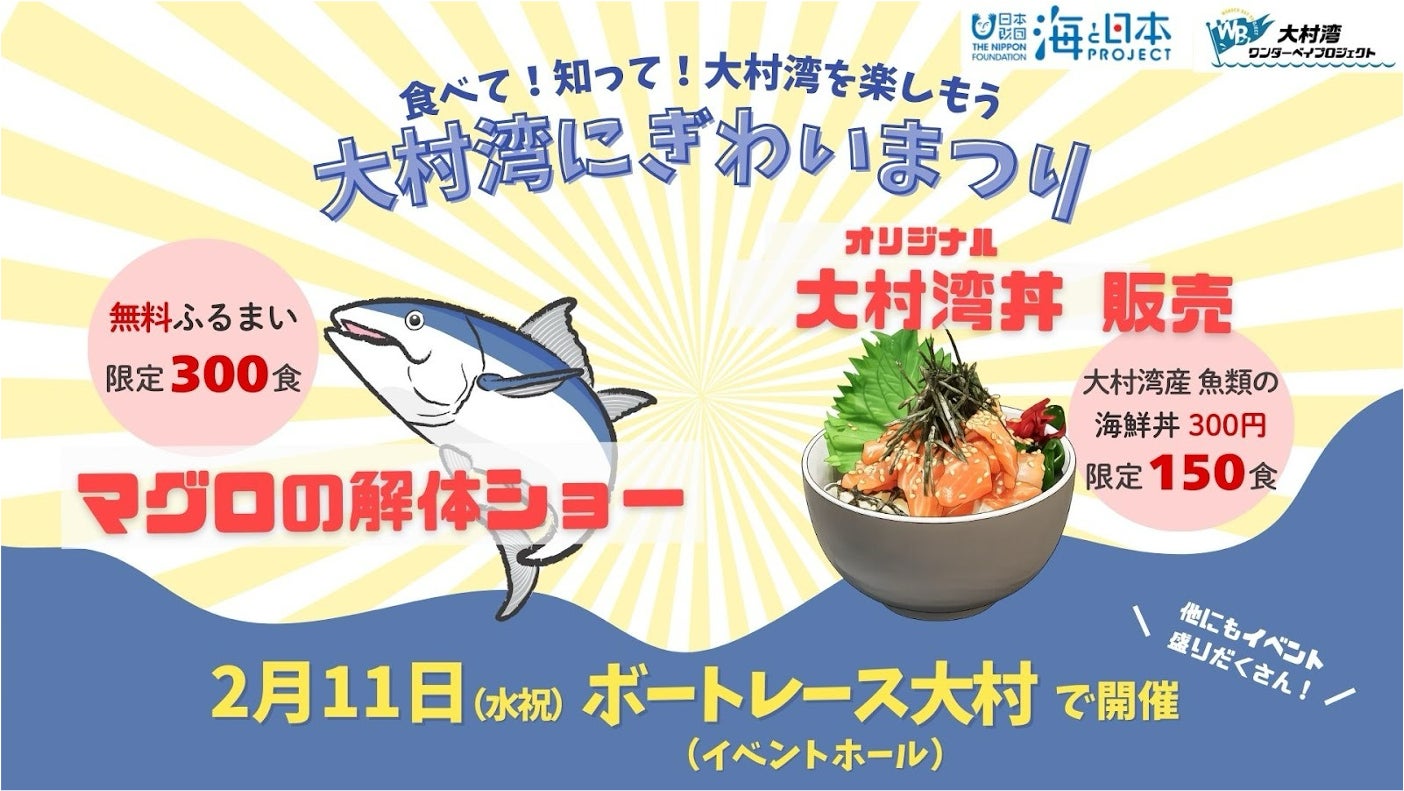 まぐろの解体ショーとまぐろの無料ふるまい、お笑い芸人の爆笑ライブなどステージイベント盛りだくさん!さらに、大村湾で獲れた魚で作る「大村湾丼」の販売や、ワークショップや食事・買い物を楽しめる大村湾マルシェも開催します。また、大村湾の有識者によるトークイベントや大村湾についてのパネル展も。楽しみながら大村湾について知って、親しむイベントです!2月11日はボートレース大村で、一緒に大村湾を楽しみましょう!