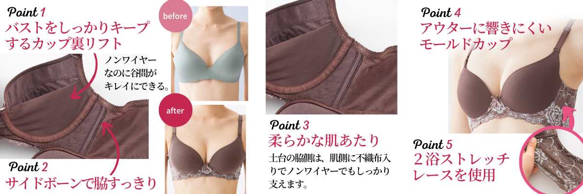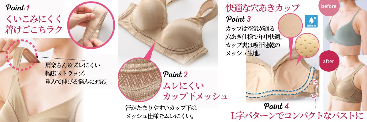 このたび、「もっと楽な着け心地に」というお客様から寄せられた声に応えるため、ワイヤー無しで「バストメイクができる」新商品を開発しました。ワイヤー入りブラジャーの着用がつらいと感じことがある方は、ぜひお試しください。