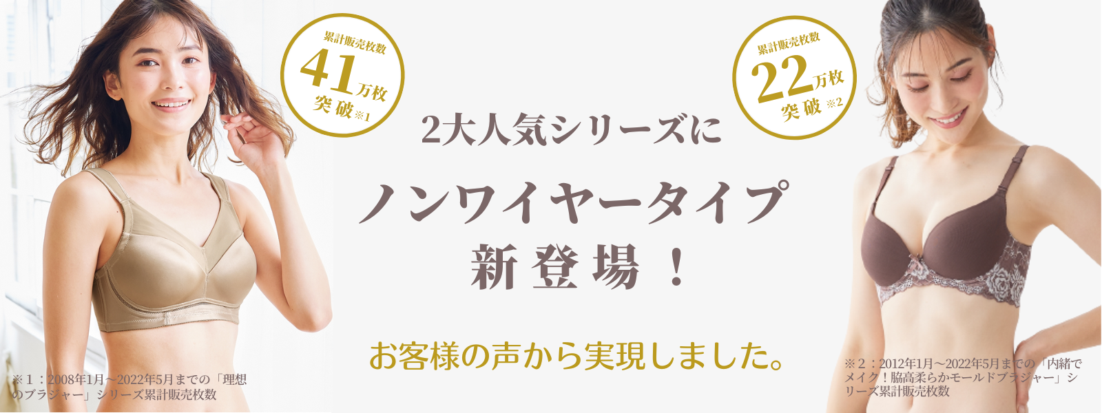 販売開始から10年以上を超え、『理想のブラジャー』シリーズは累計販売枚数41万枚(※1)、『内緒でメイク!脇高柔らかモールドブラジャー』シリーズは、累計販売枚数22万枚(※2)を突破。多くのお客様からご支持をいただいてきたロングセラーシリーズです。また、『理想のブラジャー』シリーズは、プラスサイズに対する独自の商品開発技術により、快適に着用いただく工夫を多数取り入れています。