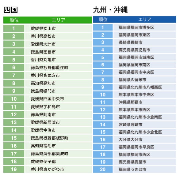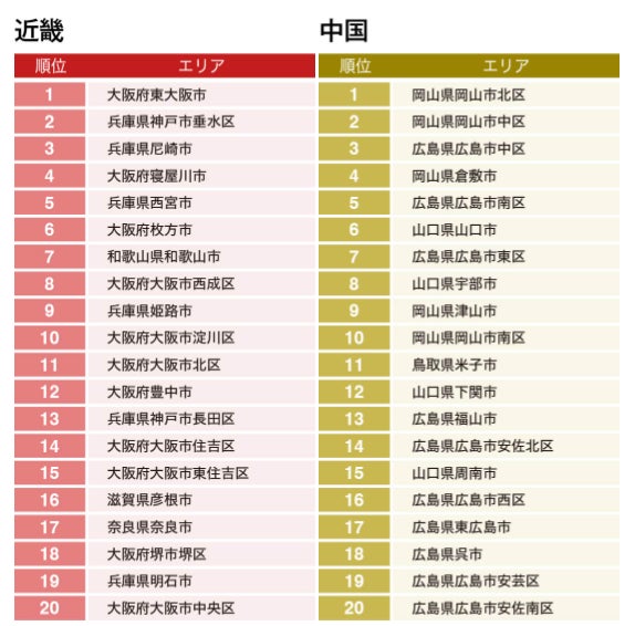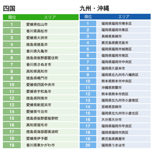 ・「大阪府東大阪市」「岡山県岡山市北区」「愛媛県松山市」「福岡県福岡市博多区」が各エリアの1位に