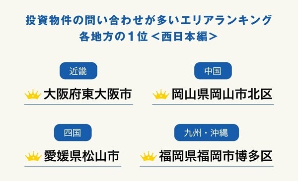 投資物件の問い合わせが多いエリアランキング<西日本編>