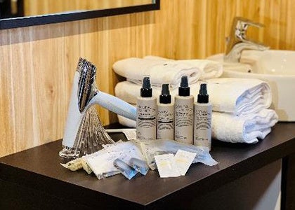 貸切展望風呂は「藤乃湯(ふじのゆ)」「煌乃湯(きらめきのゆ)」の2つをご用意。大人4名がくつろげる広さで、カップル・ご夫婦はもちろん、ご家族でもお楽しみいただけます。浴槽の手前には洗い場も完備。シャンプーやコンディショナー、ボディーソープ、タオル、ヘアドライヤーのアメニティに加え、オーガニックコスメのスキンケアラインも揃っているので、手ぶらでの利用が可能です。