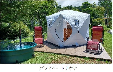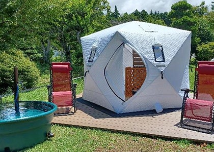 グランピング施設・藤乃煌 富士御殿場内にあるサウナ テントで「ととのう」体験を。貸切サウナでゆったりと プライベートタイムをお楽しみいただけます。