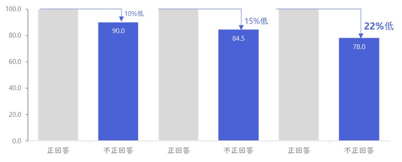 正回答者の滞在時間スコアを100とし、正回答者スコアと不正回答者スコアを比較。