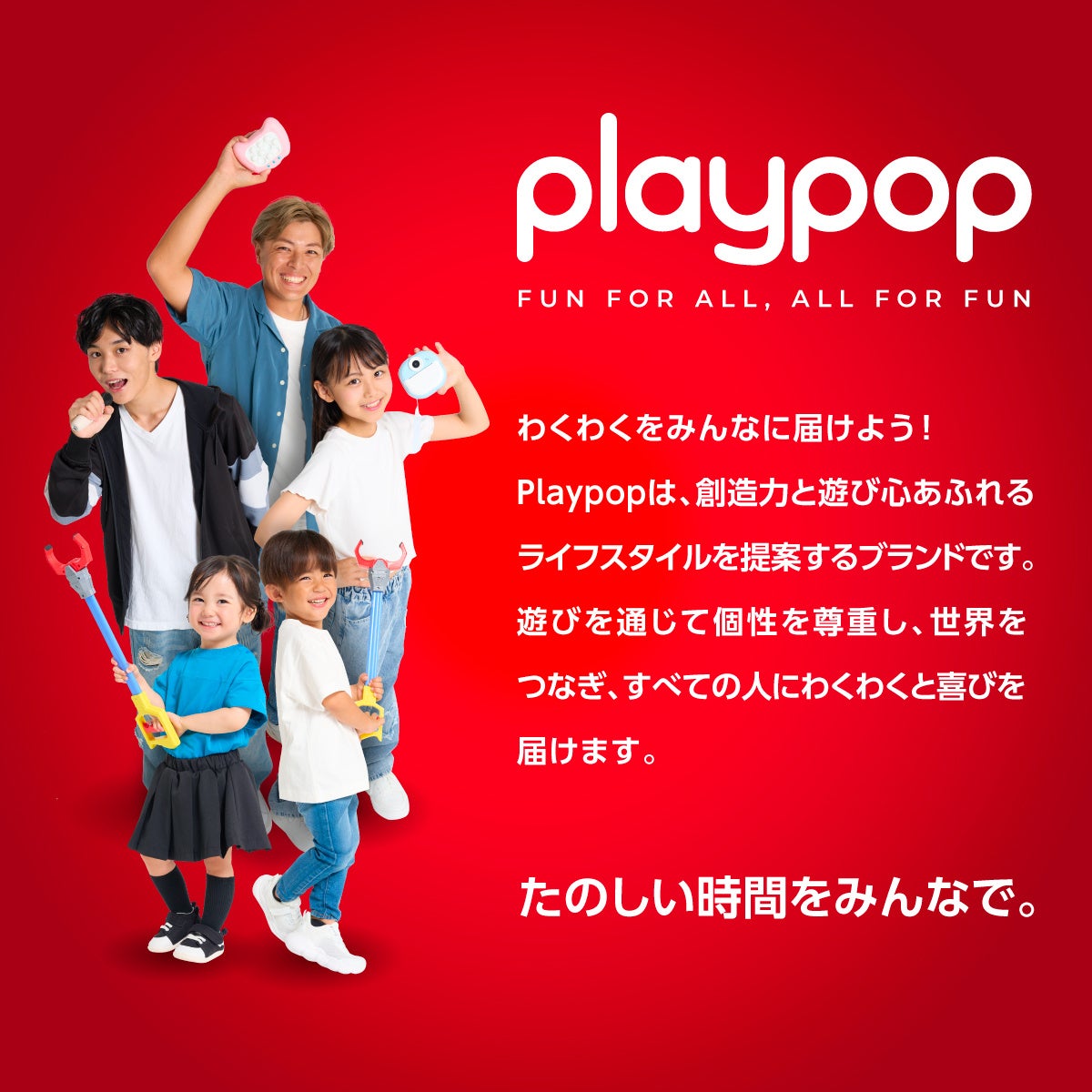 「Playpop」は「たのしい時間をみんなで。わくわくをみんなに届けよう!」をコンセプトに、遊びを通じて個性を尊重し、世界をつなぎ、すべての人にわくわくと喜びを届けるブランドです。おもちゃからライフスタイル雑貨まで、幅広いジャンル・年齢層をカバーするラインナップです。