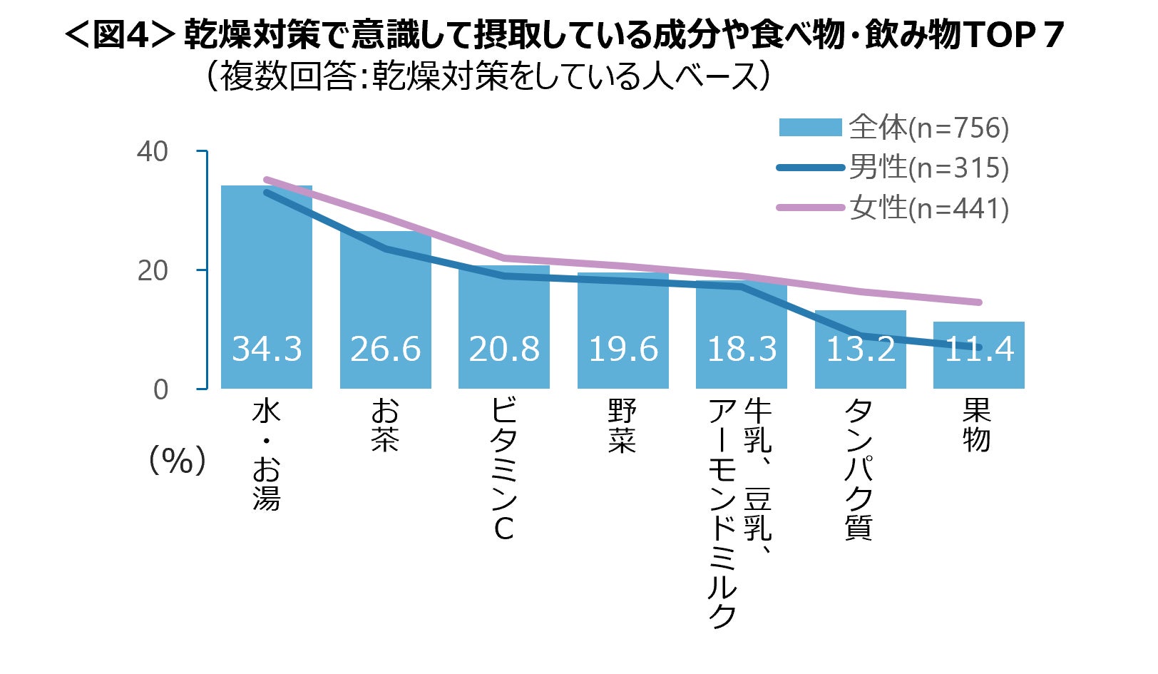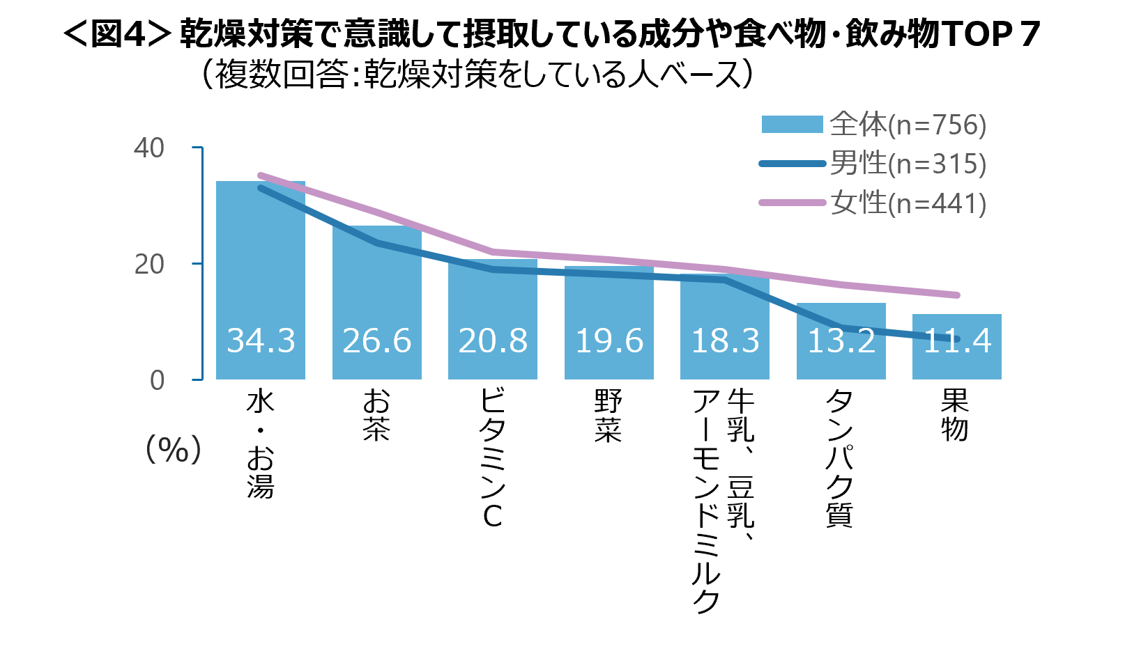 乾燥対策として積極的に摂取している成分や食べ物・飲み物に関しては「水・お湯」「お茶」「ビタミンC」「野菜」が上位にあがった。<図4>