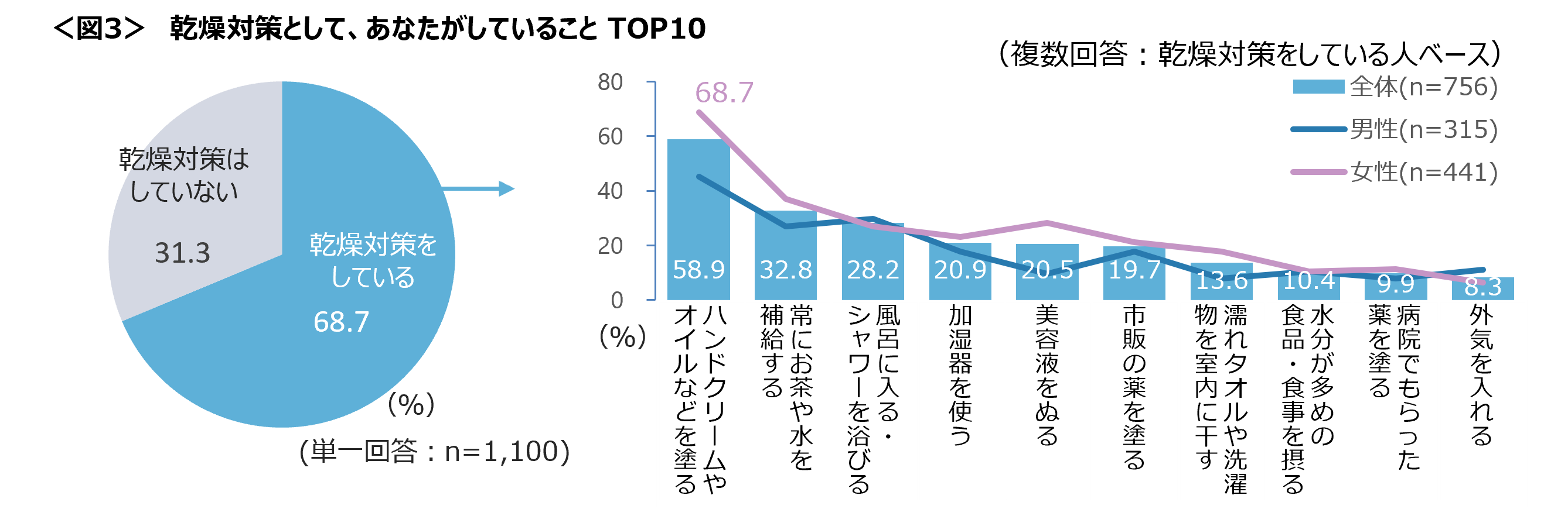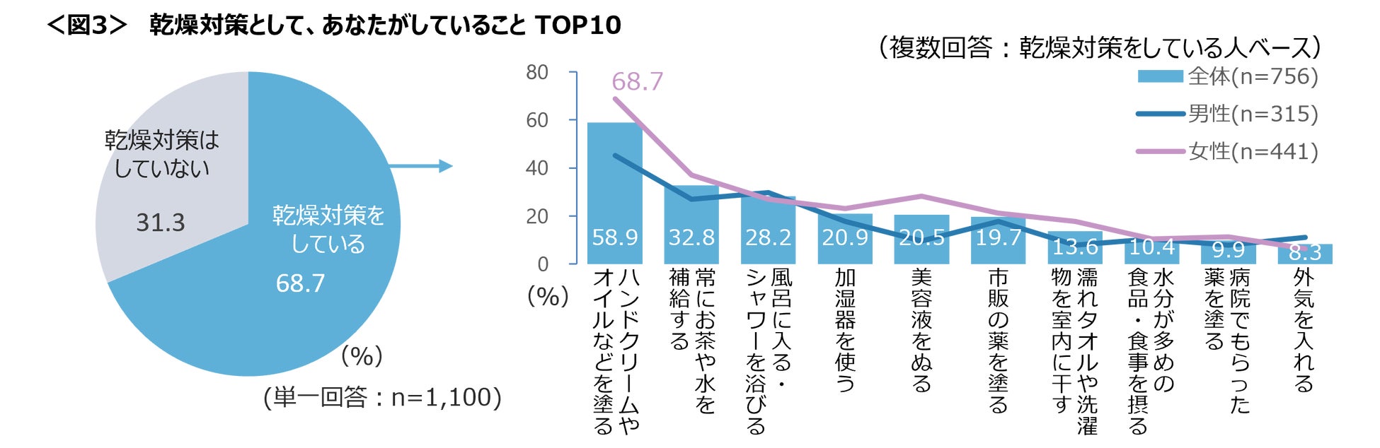 乾燥対策を行っている人は約7割。対策していることとしては「ハンドクリームやオイルを塗る」がTOP。<図3>