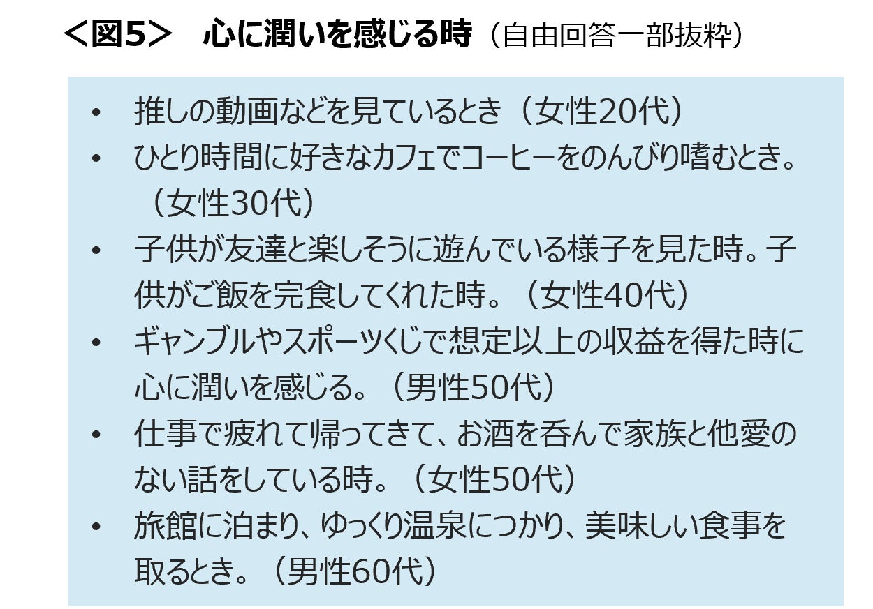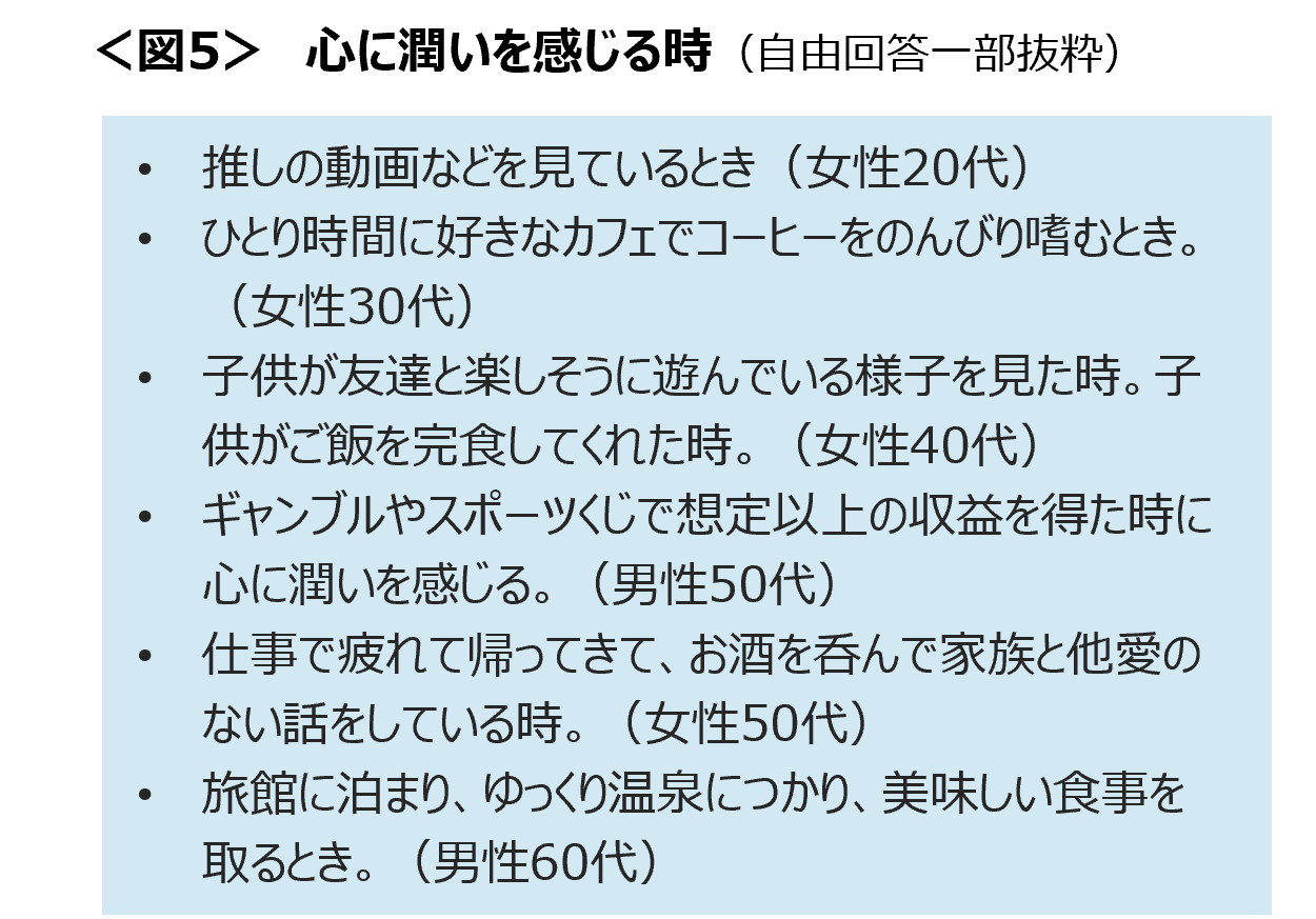 心に潤いを感じるときとしては、「ゆっくりコーヒーやお酒を飲む時間」、「家族や子供と過ごす時間」などの回答がみられた。<図5>