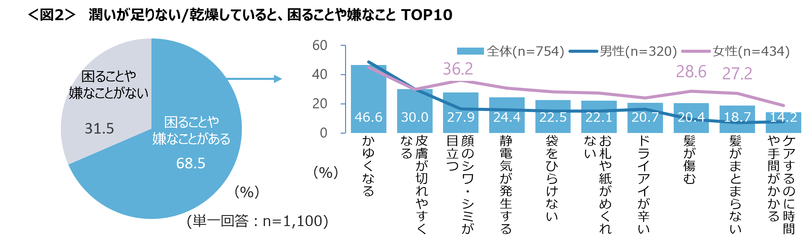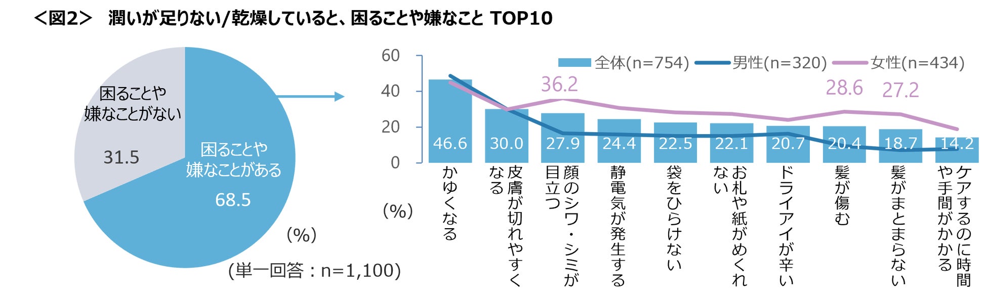 「潤いが足りない・乾燥していると、困ることや嫌なことがある」は68.5%。困ること・嫌なこととしては「かゆくなる」が46.6%でTOP。