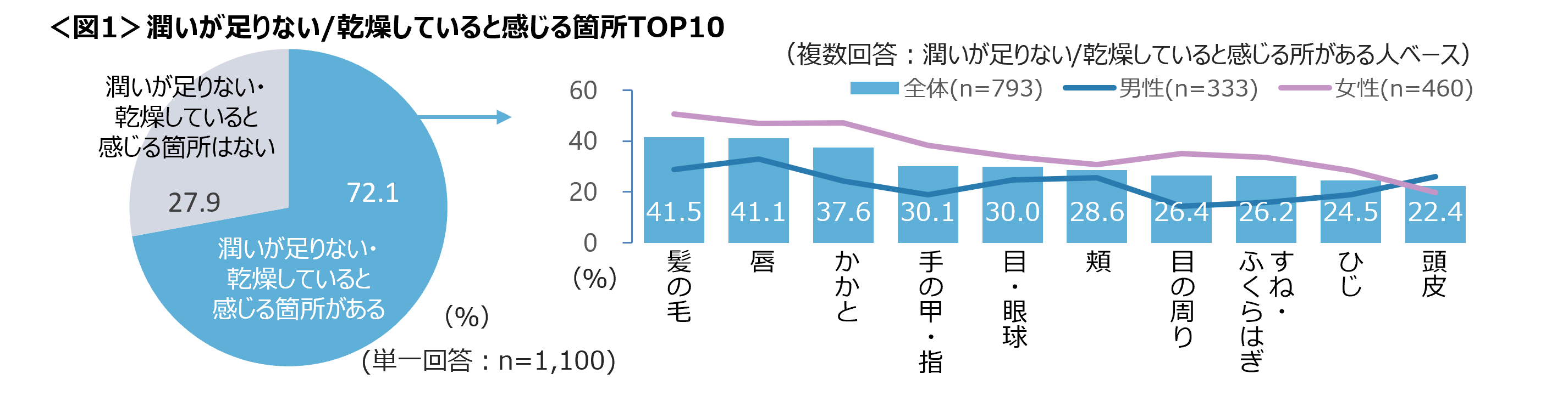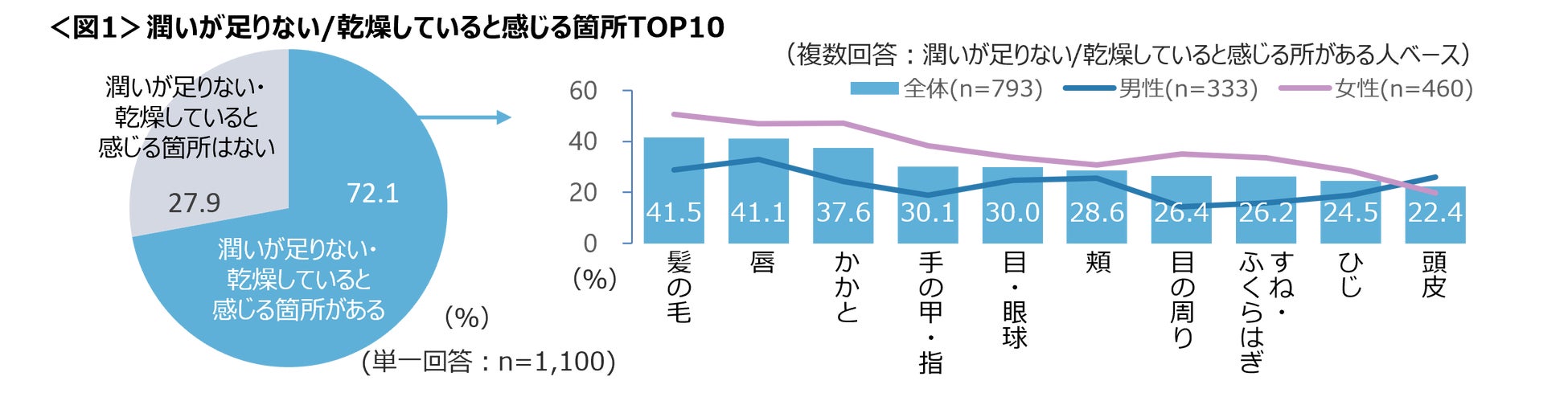 「潤いが足りない・乾燥していると感じる箇所がある」は72.1%。乾燥する箇所TOP3は「髪の毛」「唇」「かかと」。